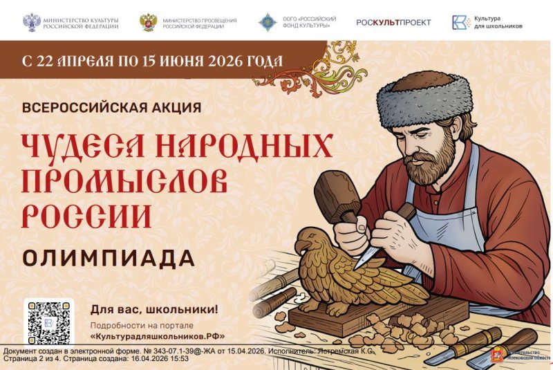 С 22 апреля по 15 июня 2026 года в рамках межведомственного культурнообразовательного проекта «Культура для школьников» пройдет всероссийская акция «Чудеса народных промыслов России. Олимпиада».